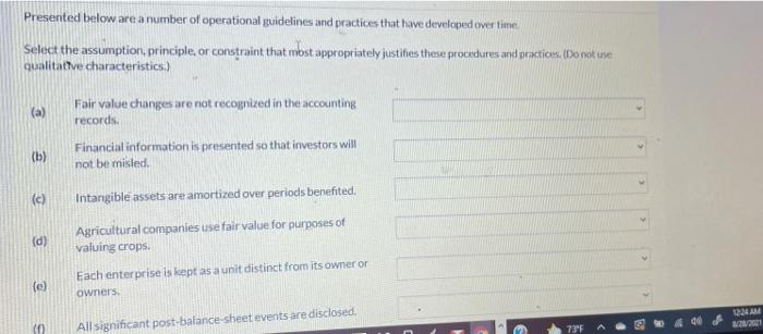 All significant postbalance sheet events are reported. Do not use qualitative characteristicsa Fair value changes are not recognized in the accounting recordsb Financial information is presented so that investors will not be misledc Intangible assets are amortized over periods benefitedd Agricultural companies use fair value for purposes of valuing cropse Each enterprise is kept as a unit distinct from its owner or. Select an option h.